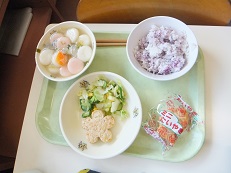 メニューはゆかりご飯・豆腐ハンバーグ・グリーンサラダ・お祝い紅白汁・ミニたい焼き・牛乳でした。