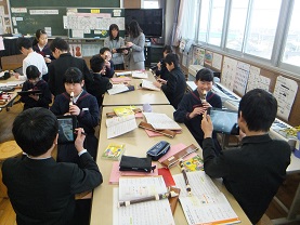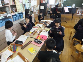 音楽の時間には、上手に演奏できるように互いにタブレットで撮影しながら練習しています。