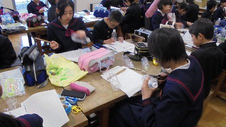 図工室をのぞいて見ました。黒板にはなにやら洋風のメルヘンチックな城の写真が掲示されています。子どもたちは、アイディアスケッチを見ながら工作しています。机の上にはペットボトルがいっぱい。材料は身近にたくさん、大小様々なサイズがあるペットボトルで作ります。すてきなシンデレラ城がたくさんできるといいですね。なぜか今日の図工室は甘い香りがぷーんとしていました。(笑)