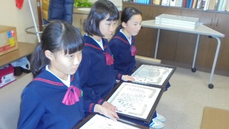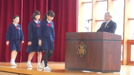 後半は、「清水賞」の表彰をしていただきました。この賞は日々善い行いに励み、他の子どもの模範となるような児童に与えられます。先日新聞にも発表されましたが、本校からは6年生塚本さん、羽田さん、三浦さんの3名が栄えある賞を受賞しました。すばらしい子どもたちこれからもがんばってほしいと思います。