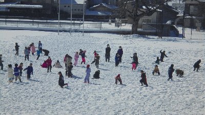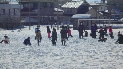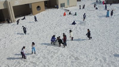 すっかり天気が回復しました。午後から1年生が雪遊びを思う存分楽しんでいました。運動上一面のたっぷりの雪、独り占め状態でした。