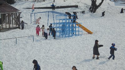 子どもたちが待ちわびていた雪が降りました。それもたっぷりと。朝は雪すかしで時間がなかったし・・・長休みはなわとび運動が忙しかったし・・・待望の昼休み、地図広場はカラフルな防寒具を着た子どもたちでいっぱいになりました。