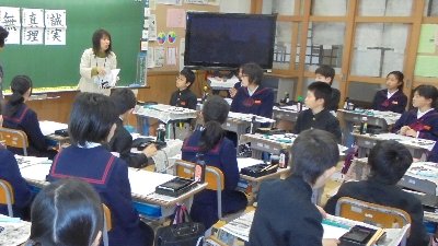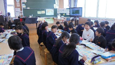 写真は音楽の授業です。この日は「世界の歌に親しもう」という題材で世界のいろいろな国の代表的な楽曲を聴いて雰囲気や違いを感じ取っていました。これも国際理解、ICTも活用されていました。