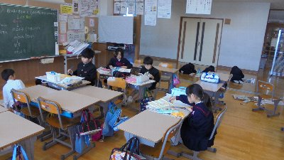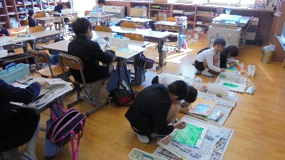 今日、3年生の教室の前を通ると図工をしていました。寒いのに教室の戸を開け放ち、のびのびと絵を描いていました。よく「のびのびとした子どもらしい絵」などと言いますが、写真を見て分かるように教室をはみ出してのびのびと(広々と?)自分の世界に入り込んで作品と向かい合っていました。どんな作品になったか、2月の授業参観でご覧下さい。
