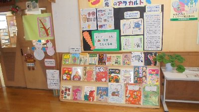 図書室の前には、いつも季節感のある掲示や本の展示がいっぱい。今回は2月、今週は立春・節分です。司書の向先生がかざってくれたり本をすすめて下さったりします。鬼の出てくる本がたくさんありましたよ。みなさん本をたくさん読んで下さいね。