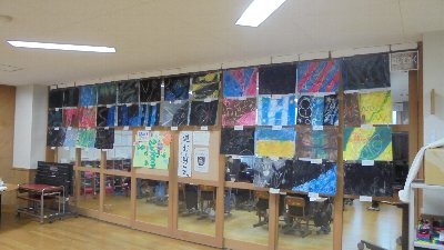 教室前にびっしりとはられた図工の作品。タイトルは「消してかく」!? 次の授業参観まで掲示されていると思います。すごい迫力です。でも教室にうまく入れるのでしょうか。(笑)