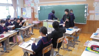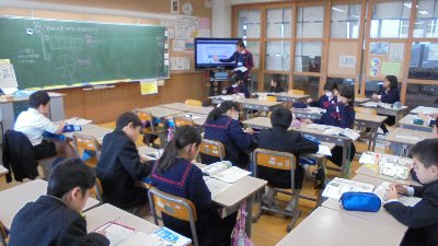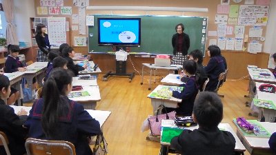 昨日は6年生の授業を紹介しました。それでは今回は5年生の授業の様子をお知らせします。先日の算数の授業の様子です。5年生では、春以来継続して少人数習熟度別学習を実施しています。自分のペースにあったメンバーとわかるまでていねいに学び合っていきます。クラスを2グループに分けるのが通常ですが、時には他の教員も加わって学年を4つに分けて実施することもあります。どの授業でも電子黒板でデジタル教科書を使用し、ICT活用に努めています。