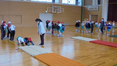 寒い日が続きます。校舎の教室は暖房が効いて快適です。でも、体育館は外と同じくらい寒いです。まるで冷蔵庫!その中で1年生が元気良く体育をしていました。マット運動です。雪が積もれば「雪遊び」をする予定です。手袋、長靴など準備願います。