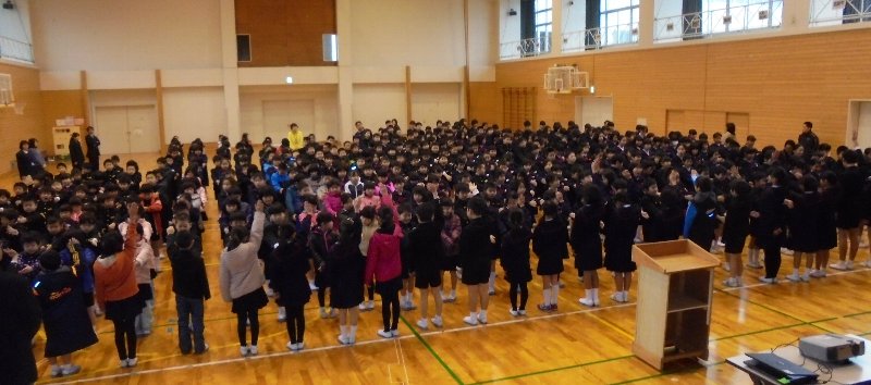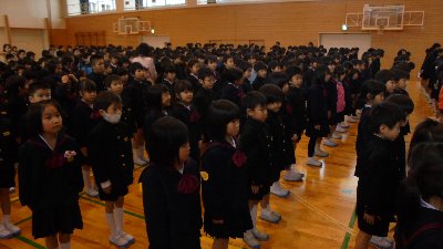 1限目は全校児童が体育館に集まり、始業式と児童集会を行いました。いつもの通り静かに素早く体育館に集まることができました。新春の体育館に元気な声、大きな声の校歌が響き渡りました。
