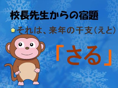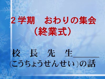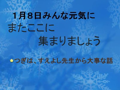 ではちょっと速いですが、「子どもたちとあわせて保護者の皆様、ご家族一同が良いお年をお迎え下さいますよう」お祈り申し上げます。