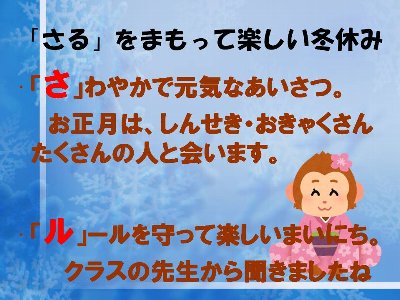 14日間、お家でもよく遊びよく学ぶ冬休みであってほしいと思います。年末年始、たいへんいそがしい時期です。お手伝いをたくさんさせてほしいと思います。そして家族で過ごす時間がたくさんあるといいですね。