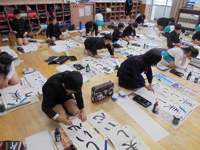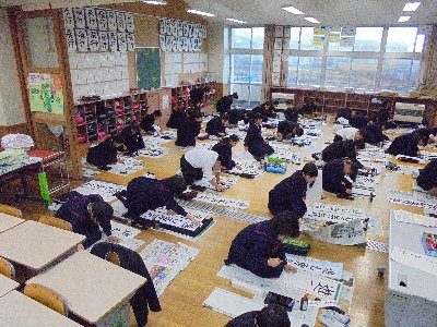 正月行事である「書き初め大会」をしています。昔から正月2日に書き初めをすると字の上達だけでなく、その年1年の学業も成果があると言われています。2日にはお家で書き初めをしたでしょうか。