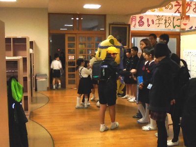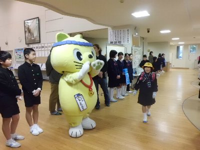 学期始めなので「にゃんたろう」が学校へあいさつ運動をするために朝早くから高小にかけつけてくれました。もう一年以上続いているPTAのあいさつ運動です。役員の皆様もにゃんたろうとならんであいさつありがとうございました。子どもたちも寒い中、今朝は6年1組が早くに登校してあいさつを呼びかけました。