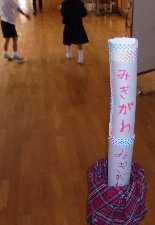 ここは1,2年生教室前の廊下とトイレへ行く廊下がぶつかる場所です。見通しが悪く、飛び出す人が多いのでこんな柱?が立てられました。いったいだれが作ったのでしょうね。これでしょうとつ事故がへるかな。