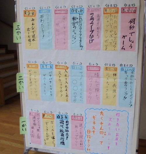 各教室、会場に看板がぶら下がっています。明日は子どもたちが楽しみにしている児童集会「ギネスに挑戦、なかよしフェスティバル」です。長休みから午前中いっぱい校内の各所を使ってなかよし班で活動します。公開もしています、子どもたちの様子をぜひ見に来て下さい。かんたんなゲームで高小ギネスに挑戦します。