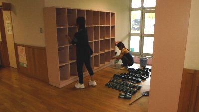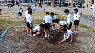先日、砂場に1~3年生の人だかり・・・何をしているのかと思えば、大きな穴を掘っています。道具がないのでどこからか木の棒を持ち寄り、毎日せっせと穴を大きくしています。どんなことでも遊びになるのですね。