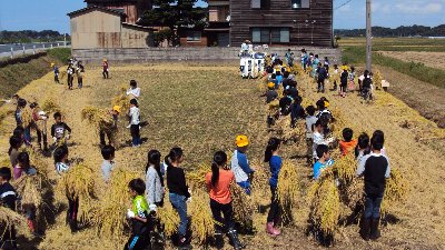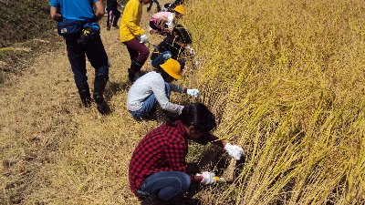 春から丹精たんせい込めて作った稲を刈らせてもらいました。田植えはしたものの、その後は瀬戸町地元の方達にお願いしてお世話していただきました。おかげさまで金色にたわわに穂がついた稲に育ちました。JAの方から鎌かまの使い方を教えてもらい、71名誰もけがすることなく無事稲刈りを終えました。刈り取った稲はコンバインに流しだっこくしてもみにしました。
