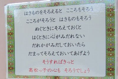 玄関では運動会が続いています。図書室からの「本の運動会」です。毎日1位が入れ替わる激戦です。どこのチームが優勝するのでしょうか。今週いっぱい続きます。げた箱はいつも写真の通りで気持ちがよいです。運動会練習でげた箱を使うことが多かったですが、きちんとかかとがそろえられています。貼り紙にもすてきな言葉が書かれています。ずいぶん前から貼られているので、あらためて紹介したいと思います。