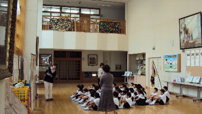 高小ではふだんから本に親しめるよう、読み聞かせを行っています。左の写真は1年生が図書室の司書さんから毎週水曜日に玄関ホールで本を読んでもらっている様子です。みんなお話の世界にはいりこんで集中して聞いています。もう一枚の写真は、各教室で行われている朝の読書タイムの様子です。今日は3年生も先生から本を読んでもらっていました。