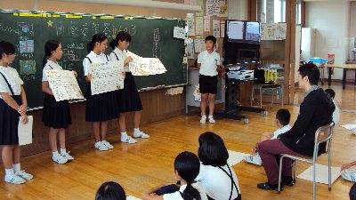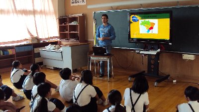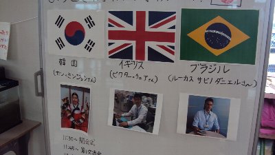 この日のために子どもたちは相手・外国人に伝えたい日本の文化について調べました。そしてそれぞれが資料を見せながら伝えました。・・・幸い3名とも日本語が上手でした。そして、ブラジル、イギリス、韓国のことについて教えてもらいました。知らないことばかり、驚かされることもたくさんあり、「いってみたい!」という声がたくさん聞かれました。どんなことが印象に残ったのかお家でお子さんとお話下さい。この子達は将来大きな世界に羽ばたいていくのでしょうね。ルーカスさん、ビクターさん、カンさん、今日はほんとうにありがとうございました。