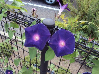 宇宙のアサガオがたくさん咲いています。もうすでに種になっているつるもあります。