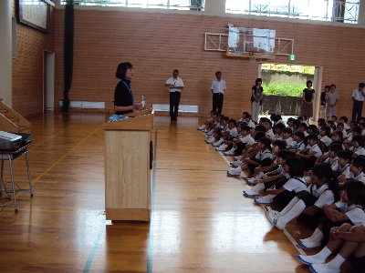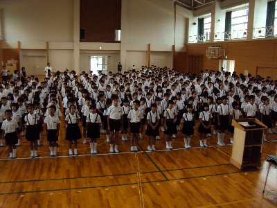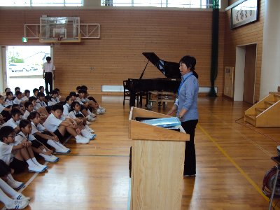 1限目は全校が体育館に集まり、始業式をしました。元気に校歌を歌った後、新しい先生をお迎えしました。4年2組の担任となる 高畠 美香 講師です。体育が得意な先生で今度の運動会ではきっと活躍してくれることでしょう。また、末吉先生のマスターズ世界陸上の銀メダルも全校にお知らせしました。2学期はこの貴重な体験を道徳の時間に学ばせてもらいます。子どもたちの中からは、夏休みの間音楽室に練習に通い「童謡歌唱コンクール」に入選した8名を表彰しました。代表は、5年折戸さんと土田さんでした。がんばったね。