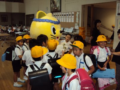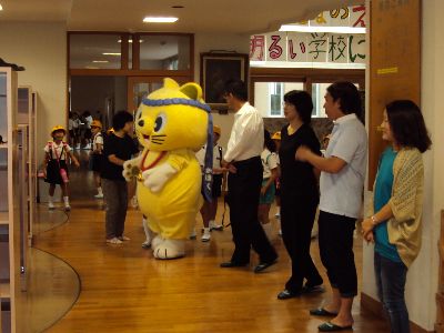 もうすっすかりいつものことになりました。学期始めのあいさつ運動に「にゃんたろう」登場。あいにく風が強く外での活動はできませんでした。(頭が大きくて飛んでいきそうでした。)PTAの役員のみなさん竹中さん、竹田さん、紺木さん、坂本さんがいっしょにあいさつ運動をして下さいました。にゃんたろうを高松小学校に呼んだのはちょうど1年前でした。PTAのアイディアであいさつ運動に参加してもらうことになりました。初めて学校に来たとき、子どもたちはびっくりしてなかよくなれませんでしたが、今ではすっかり・・・写真の通りです。にゃんたろうはわけあって声は出ませんが、その分子どもたちが元気良くあいさつします。次は3学期の始めに会えますね。そうそう、ただいま全国ゆるきゃらグランプリの真っ最中、いそがしいのにありがとうございました。優勝できるといいですね。応援しています。ホームページをご覧のみなさんもhttp://www.yurugp.jp/vote/detail.php?id=00000130ここから応援してあげて下さい。