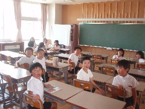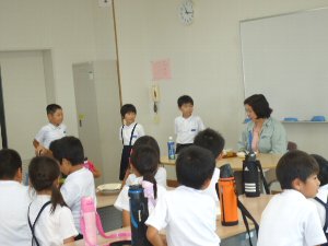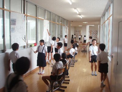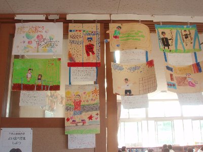 今日は3年生と4年生が、それぞれとなりの大海小の3年4年を招いて合同の活動をしました。どちらの学年も学習で調べまとめたことを発表して聞いてもらいました。最後はとてもなかよくなり、バスの出発までおにごっこをして遊びました。