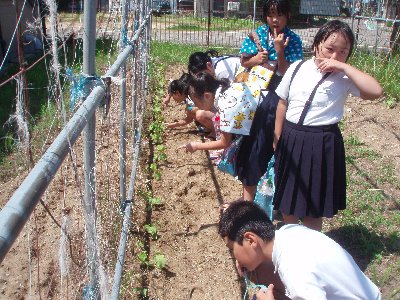 先週、プール横の学校園(畑)にヘチマを植え替えしました。大きなたながあり、これからすくすく大きくなってたなから立派なヘチマがぶら下がる予定です。道路からすぐ見える場所なのでいっしょに成長を見ていただければと思います。