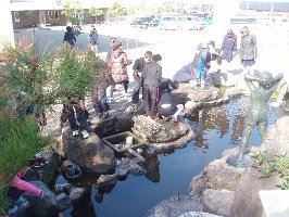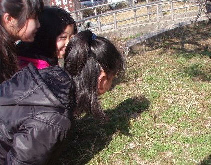 先週は、雪が積もってびっくり、今週は一転春らしい陽気になっています。先週に比べて温度が10度以上暖かいようです。そんな中、学校正面の池の周りに4年生たちが何かをさがしています。