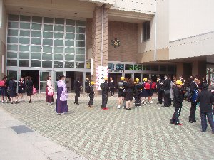 最近、結婚式や成人式で晴れ姿の「前撮り」というのが流行っているそうですね。卒業式、なかなかシャッターチャンスは難しいものです。そこでこんな写真はいかがでしょう。卒業生が在校生に向かって呼びかける配置です。立ち位置が事前に分かっていればOK、この写真をプリントしてもOK。・・・あらっ、練習なのでマスク姿も(笑)