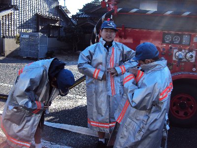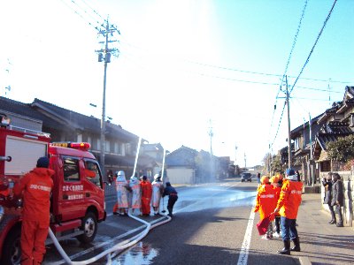 早朝より各町会で消防器具、消火栓の点検が行われました。訓練の放水も行われ、この季節にしては珍しい晴天の中、高々と放水され虹がきれいでした。中央通りを下った中町通では、6年生の消防クラブに参加している子どもたちも消防団の皆さんに指導され、放水訓練をしました。