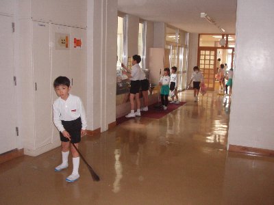 そんじの取りかかりが早いです。合図のチャイムの前からそうじ場所に集まって始めることができます。そうじ中は無言で一言もしゃべらずきれいにします。そうじの時間は学校中に人がいなくなったかのように静まりかえります。その中で黙々と校舎をきれいにします。そしてなかよし班で1~6年助け合って教え合って力を合わせて、そうじします。しばらくインフルエンザが流行っていたので学年ごとにそうじをしていましたが、今日から久しぶりになかよし班のそうじにもどります。