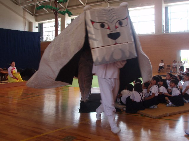 「トラたいじ」お話のあらすじは、ぜひご家庭で子どもさんに聞いてみて下さい。1年から6年までみんなが楽しむことができる内容でした。ステージと客席が一体になって最後までみんな大興奮でした。本物と出会える幸せ、貴重な経験のできた日になりました。