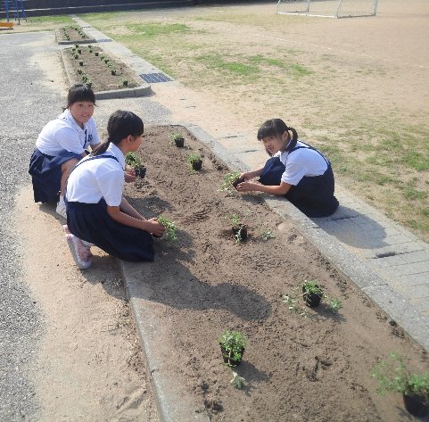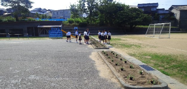 低学年教室外の花壇はチューリップが咲いていたのは遠い昔で、今は農園と化しています。たくさんの野菜が実を付け始めています。中にはキュウリなどすでに収穫の始まったものもあります。花壇に花を植えられないので地図広場と運動場の境目の花壇に園芸委員が花苗を植えてくれました。水やりが難しいところです。しっかり世話をして立派な花を咲かせて欲しいものです。