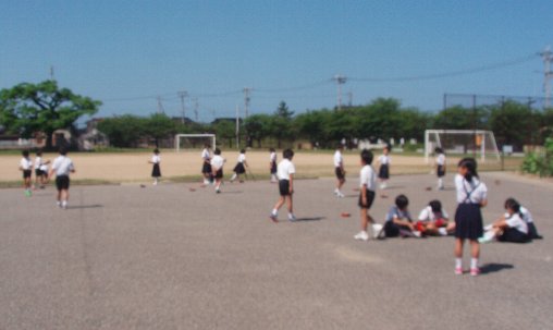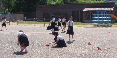 先週は3年生が地図広場で太陽の動きとかげの長さを学習していましたが、今日は4年生が理科の学習をしていました。太陽光を電気に変えてソーラーカーを走らせていました。梅雨の最中なのに雲一つ無い青空の下、子どもたちの車は勢いよく走っていました。