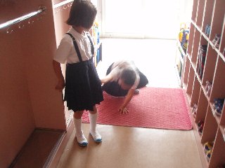 4年生がアイマスク(目かくし)をして校内をペアで歩いてみました。玄関のふだん気づかないようなちょっとした段差につまずいて転んでしまいました。階段はとてもこわかったです。