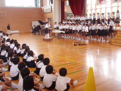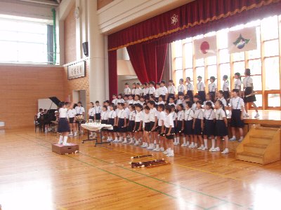 一番最初に来週18日内灘文化会館で行われる河北郡市小学校音楽会に学校代表として出場する5年生の音楽発表を全校全参観者で聞きました。素晴らしいハーモニーでした。曲も良いできでしたがなんといっても5年生のチームワーク、心が一つになっていたところが聞く者の心を動かすような歌いぶりでした。
