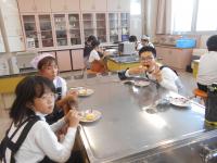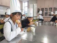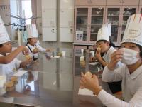 子どもたちもコック帽をかぶってワクワクしながら授業がスタートしました。普段は何気なく摂っている食事ですが、今回は五感(視覚・聴覚・味覚・嗅覚・触覚)、五味(甘味・塩味・酸味・苦味・旨味)を感じながら食事を楽しむことを学びました。砂糖・塩・酢を舐め、舌は味を感じる部分が違うことや、グミを目をつむり、鼻をつまんで食べてみると…「グミを食べとるってわからん」「なんとなく甘いけど味わからん」「鼻をつまむのをやめたら香って味がする」などの体験を通して、触覚・嗅覚・視覚の大切さも学習しました。授業の最後にはなんとシュークリームが登場!子どもたちは大喜びしながら、手で食材を感じ、舌でシューの皮の塩味やクリームの甘味、クリームにほのかに隠れているレモンの酸味などをよく感じながら味わって食べていました。これからの食事がより一層楽しくなりそうですね。貴重な体験をありがとうございました。