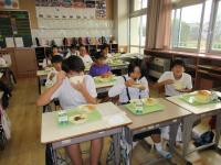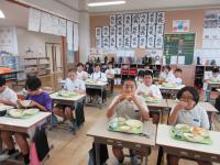 今日の給食のメニューは、米粉ミルクロール、牛乳、とびうおバーグフライ、きのこソテー、大崎だいこんのポトフでした。今日使われている地場産物は,「米粉」、「まこもたけ」、「河北潟ポーク」、「大崎だいこん」、「河北潟れんこん」、「白ねぎ」、「河北潟牛乳」です。かほく市大崎では、スイカを収穫した後に大根を栽培しているそうです。大崎の広い砂丘地は日当たりがよくミネラルが豊富な土壌で、寒暖差もあることから、白くきめ細やかで、甘みのあるおいしい大根になるそうです。子ども達は地場産物たっぷりの給食を、おいしそうに味わっていました。