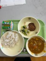 10月27日から11月9日の2週間は,秋の読書週間です。読書週間にちなんで,給食と絵本がコラボレーションした「絵本献立」が登場します。11月6日(水)は,みやにしたつやさんの「ほうちょうさん ききいっぱつ」に登場するハンバーグカレーとサラダが出ました。絵本に出てくるハンバーグに負けないおいしさのハンバーグを,調理員さんたちが作ってくれました。子ども達は,ふっくら焼きあがったハンバーグと,じっくり煮込んだカレーをうれしそうに食べていました。「ほうちょうさん ききいっぱつ」は,インスタント食品と台所の道具たちの大騒動を描いた楽しい食育絵本です。興味があれば,ぜひ親子で読んでみてください。明後日の8日も,絵本献立です。