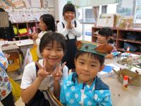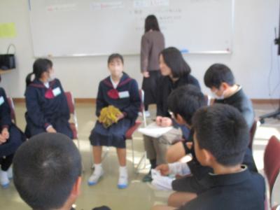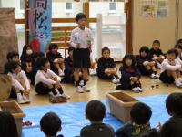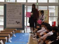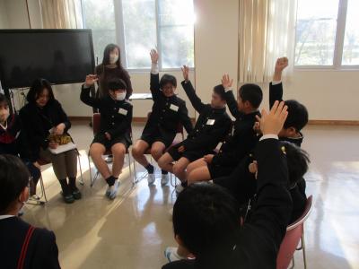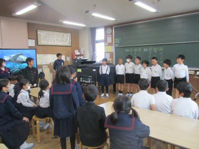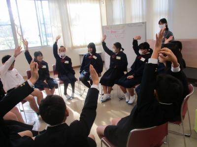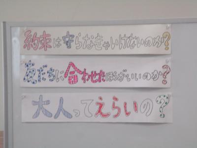 5年生が西田幾多郎哲学館の職員の方々による哲学対話教室を行いました。「この部屋に大人は何人いる?」「大人と子どもの違いは?」などの質問に子ども達は意欲的に答えていきました。次に、2つのグループに分かれて対話しました。1つのグループは「大人ってえらいの?」という問いでした。最初は「子どもにはゲームの時間を制限するのに、自分は好きなだけやっている。ずるい!」「大人が戦争を行い、多くの死者をだしている」といった否定的な意見が多く出されました。そこで「えらいとこはないの?」と問いかけられると「自分たちの将来のことを思って叱ってくれる」「働いて子どもを育ててくれる」と言った肯定的な意見も出されました。さらに「えらいと思う大人は?」との問いに対して「親」「ワクチンを作った人」「戦争から赤ちゃんを守っている人」などが挙げられました。全員が45分間、よく考え対話することができました。