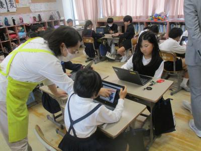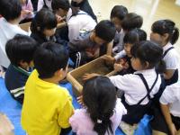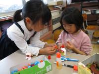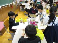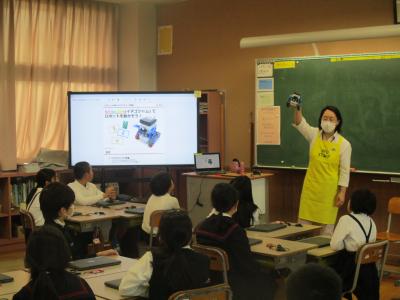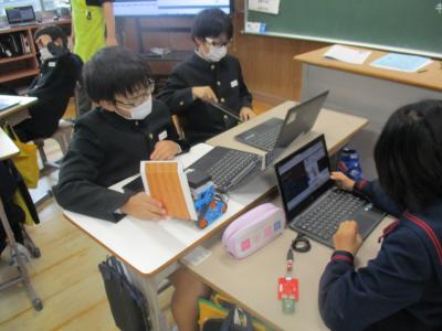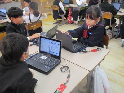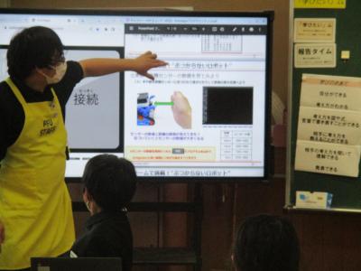 4年生がPFUの楯岡さんと久保石さんからプログラミングについて学びました。最初にプログラミングとは何かを簡単に教えて頂きました。自分たちの身の回りにある多くの電子機器がプログラムによって動いていることを知りました。次に、実際にプログラミングを体験しました。ダイオードを点滅させたり、ロボットを動かしたりしました。特にロボットを思い通りに動かすための時間調整が難しく、グループで結果を共有しながら何度も挑戦し、思い通りに動いたときはとてもうれしそうでした。