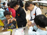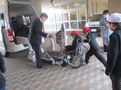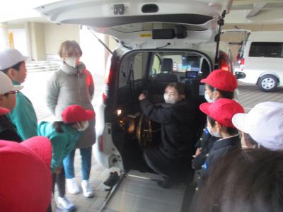 福祉車両体験では3台の車両に分かれて3人グループで車への乗降を体験しました。石川トヨタのスタッフの方に教わりながら、フックを掛けたり、ブレーキを掛けたりするなど一つ一つの操作を確認しながら安全に介護活動ができました。障害者に対して自分自身がどのように関わればよいかを考えるよい機会となりました。