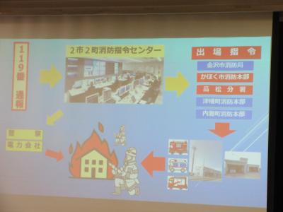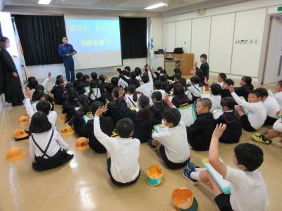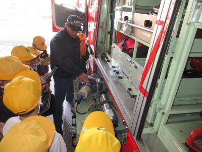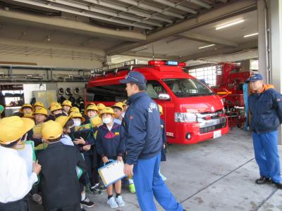 3年生が社会科の「火事からくらしを守る」学習で、かほく市消防本部の見学に行きました。最初はかほく市の消防組織や119番通報から消火活動までの仕組み等、スライドで説明していただきました。その後、実際に消防車を見せていただいたり、防火衣を着させていただいたりしました。消防署の人たちは,火事に備えて,さまざまな準備や訓練をしていることに気づくことができました。