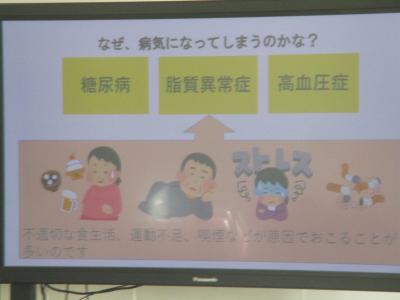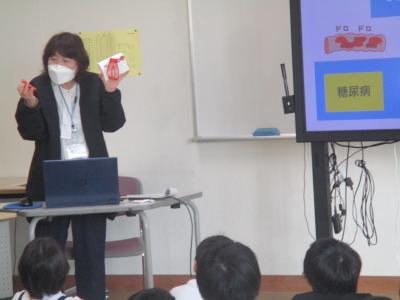 6年生が、かほく市給食センターの栄養教諭お二人と、かほく市役所健康福祉課の保健師さんによる「中学校に向けての食育と健康」についての授業を受けました。事前に行ったアンケートによると、毎日朝食を食べている6年生の割合は約90%でした。また、朝食の内容を見ると、おかずを食べていない人が半数以上でした。成長真っ盛りの時期です。これからの中学生生活に向けて、どんな栄養がどれだけ必要か、また、血管や心臓などの模型を見ながら、私たちの体に起こるかもしれない病気についても学びました。6年生は、中学校の写真を見ながら自分が進学する学校や数カ月後、何年後の自分を思い描きながら、授業を受けていたようでした。朝ご飯を食べること、夜はしっかり睡眠をとること、体を動かすことを実践していきましょう!