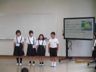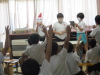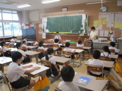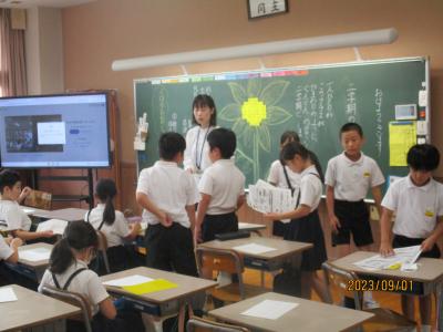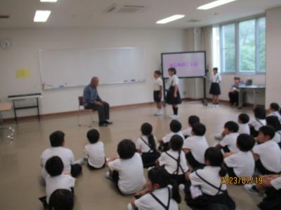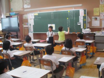 2年生が畑の先生である駒井先生をお招きしてお礼の会を開きました。今まで育ててきたキュウリやピーマン、ナスビ、エダマメについてその育ちを発表したり、それらの野菜に関するクイズを出したりと、自分たちが学んだことを生かして発表することができました。また、代表が駒井先生にお礼の言葉を述べたり、それぞれが書いた感謝の手紙を綴ったプレゼントをお渡しするなど、感謝の気持ちをしっかり伝えることができました。駒井先生は、子どもたちが、育てた野菜の特徴を細かく観察していることに驚かれていました。今度は秋野菜として大根を育てるということを聞いた子どもたちは、早くも意欲満々の表情をしていました。