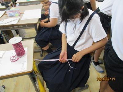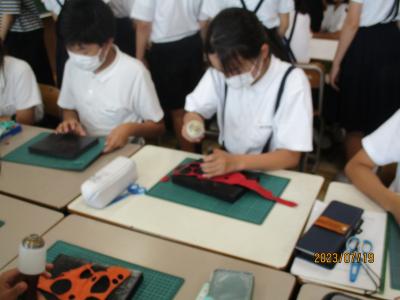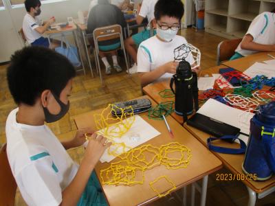 6年生は総合の時間に「高松地区盛り上げ推進プロジェクト」に取り組んでいます。今日は、その一環として、ボーガニックの小坂さんの指導で、革細工を体験しました。二口製紐さんに提供して頂いたゴム紐を編んで、皮をくり抜き、チャームを取り付け、素敵な腕飾りを作りました。今後、試作を繰り返し、10月14日の創立記念式典で販売する予定です。