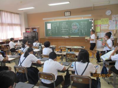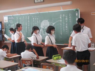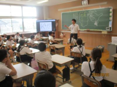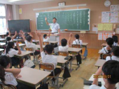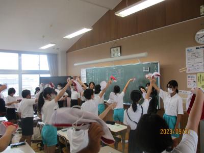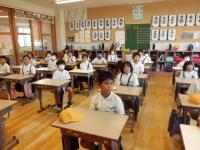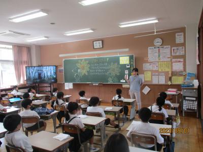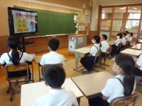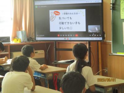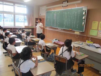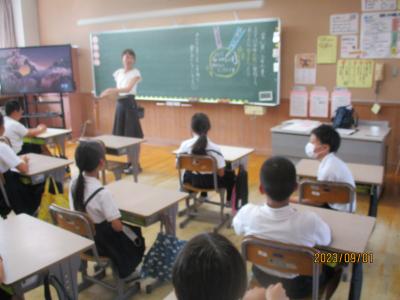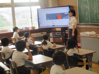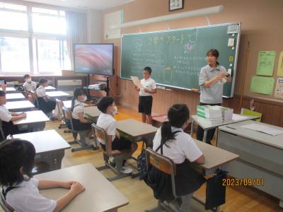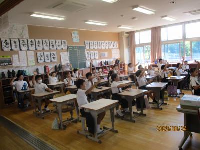 今日から2学期がスタートしました。毎日暑い日が続いていますが、子どもたちは元気に登校してきました。始業式は熱中症予防のため、放送室からの映像を各教室で見ながら行われました。休み中に各教室のテレビが65インチの大型モニターに変わり、美しく大きな画面で見ることが出来ました。学校長からは、「行事を通して自分を成長させるために、めあてとふり返りを大切にしよう」という話がありました。その後、各教室では夏休みの課題や提出物の点検、夏休みの思いで紹介、後期の教科書の配布、2学期の係決め等が行われていました。6年生は9月23日の運動会に向けて応援の練習をスタートさせました。依然、コロナ関係で欠席している児童もいますが、2学期も感染予防熱中症予防に努めながら、教育活動を進めて参ります。