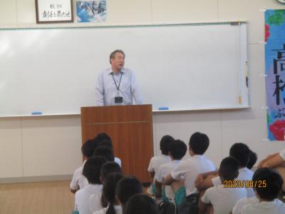熱中症対策のため校内放送で行いました。学校長から1学期の成長、体育担当からは夏休みのプール開放、生徒指導からは夏休みの生活について話がありました。